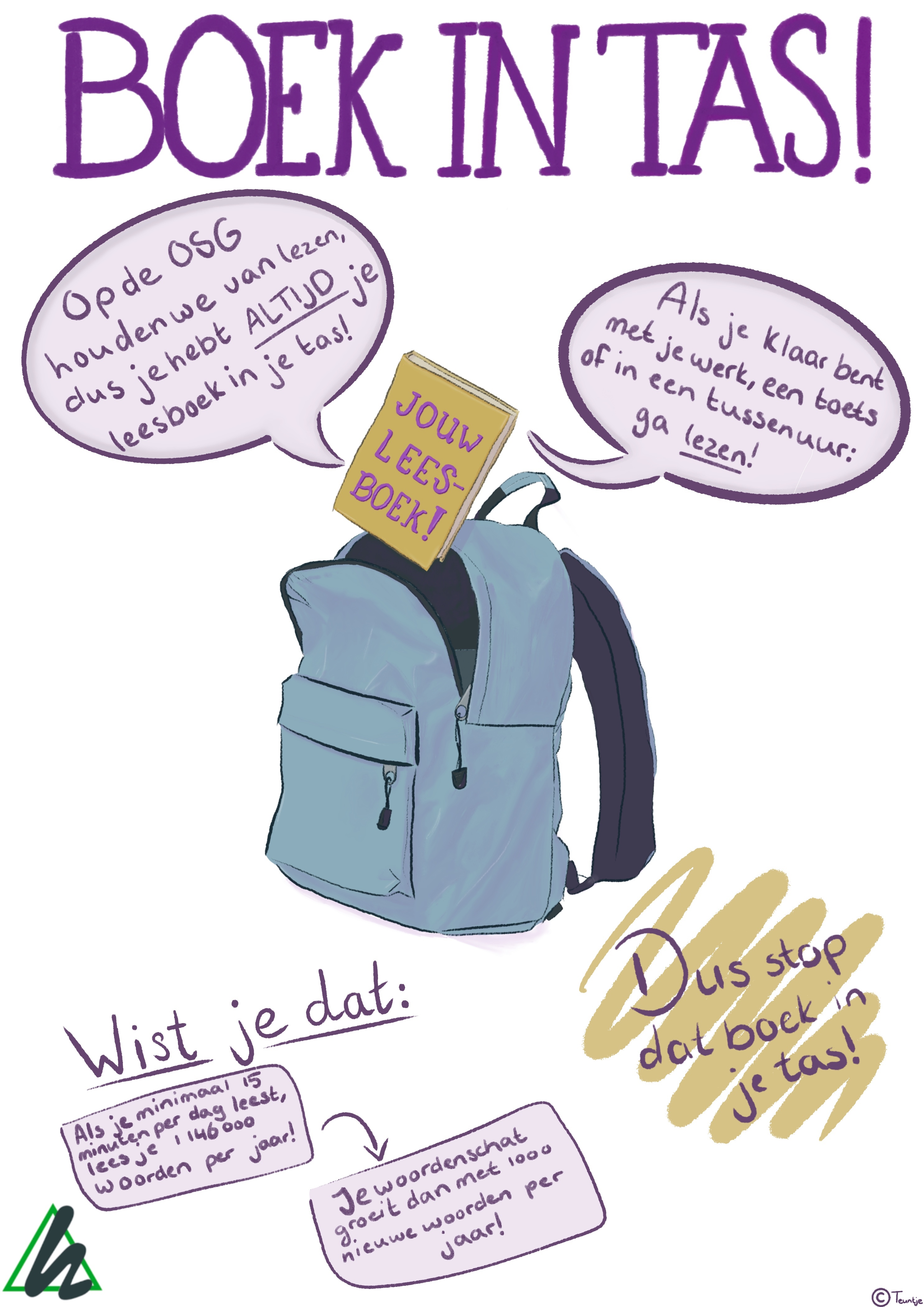 De actie “BOEK IN TAS’ houdt in dat we van alle leerlingen verwachten dat ze ALTIJD een leesboek bij zich hebben, zodat ze kunnen lezen als ze klaar zijn met de opdrachten van een willekeurige les, als ze eerder klaar zijn met een toets, als ze een tussenuur hebben enz. We hebben een prachtige goed uitgeruste mediatheek waar leerlingen altijd gratis boeken kunnen lenen, waar ze goed advies krijgen en waar ook heerlijke plekken zijn om te zitten lezen.