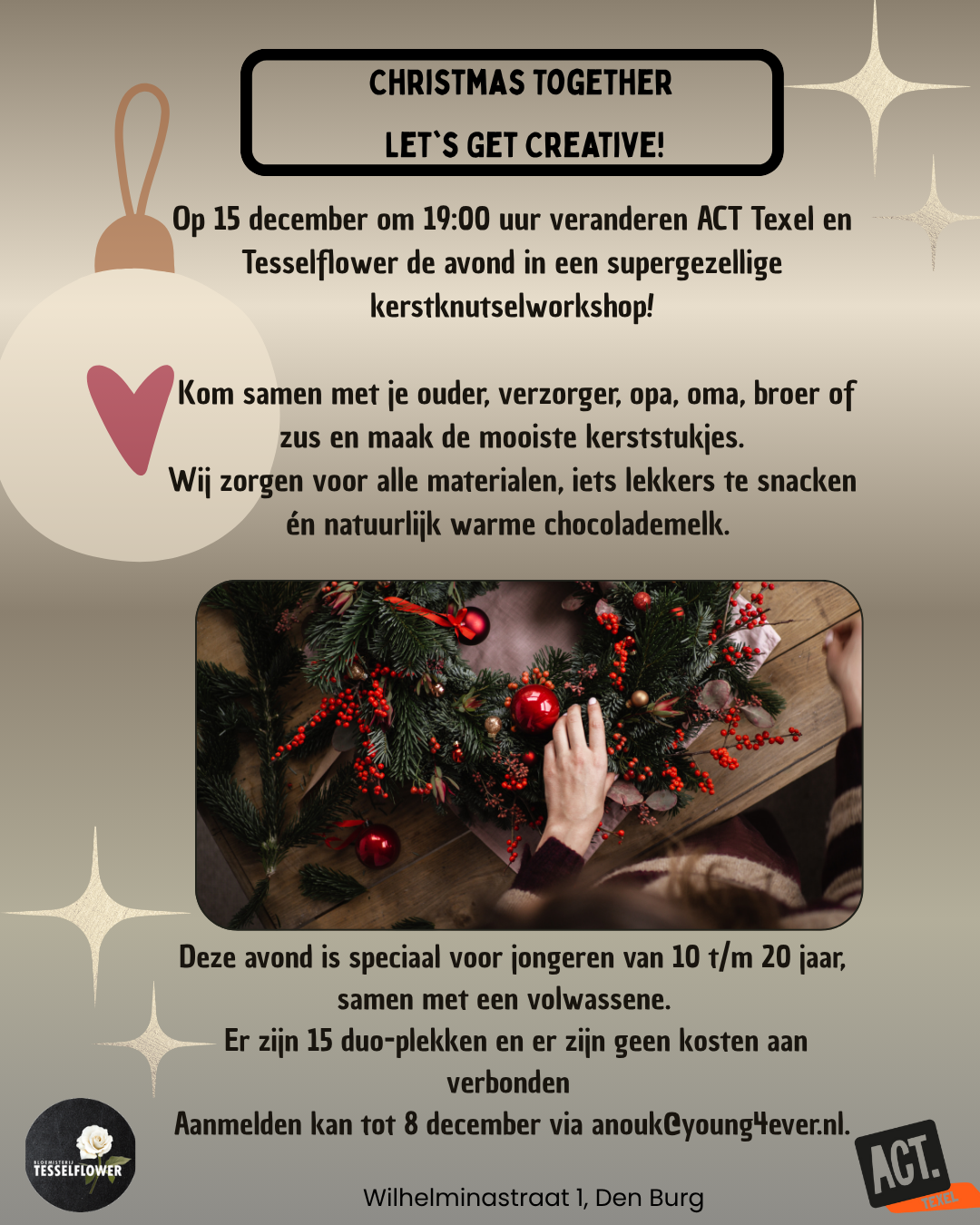 Op 15 december om 19.00 uur veranderen ACT Texel en Tesselflower de avond in een supergezellige kerstknutselworkshop!
