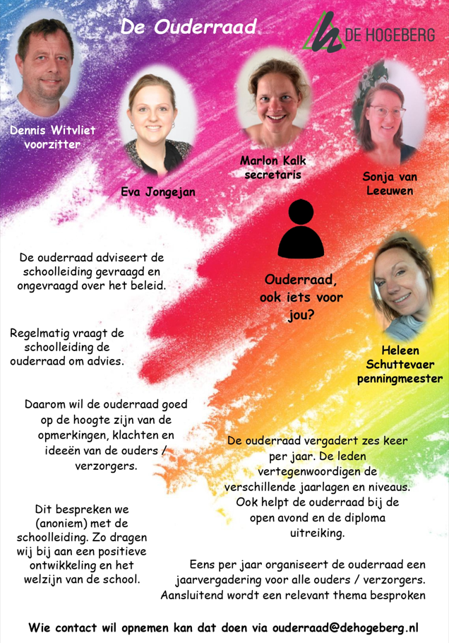 Helaas hebben we voor onze Ouderraad nog geen nieuwe ouders gevonden die willen aansluiten. Daarom zouden we graag in een apart weeknieuws berichtje onze flyer nog willen delen. Deze stuur ik als bijlage mee.
