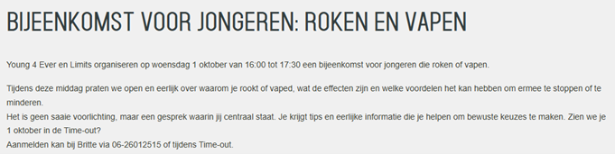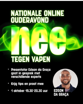 Dit in navolging van de online nationale ouderavond "nee tegen vapen" en de Young4Ever-bijeenkomst afgelopen week voor jongeren in de Time-out.