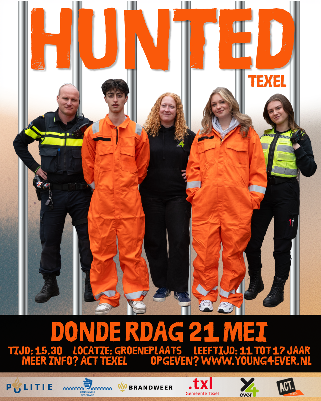 Op donderdag 21 mei verandert het centrum van Den Burg in het speelveld van een spannend achtervolgingsspel: Hunted. Maar liefst 120 jongeren trekken een witte overall aan en proberen zo lang mogelijk uit handen te blijven van de jagers.